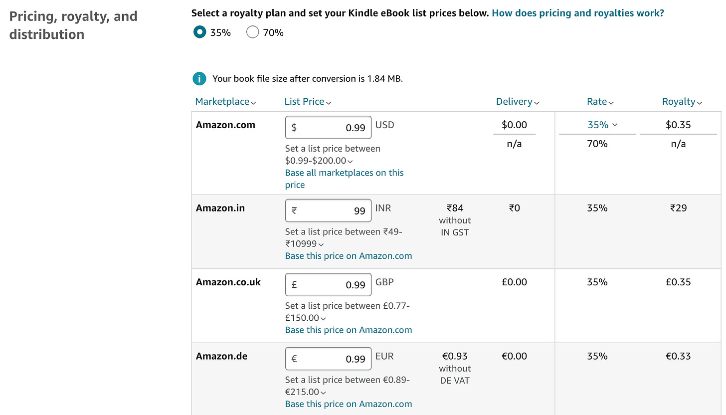 Royalties: KDP offers to options: at the 35% level they take transfer costs; it’s the only way to price as low as $0.99. At the 70% level the commission is higher but the author has to pay delivery costs which is tricky in my case given its large illustrated images.
